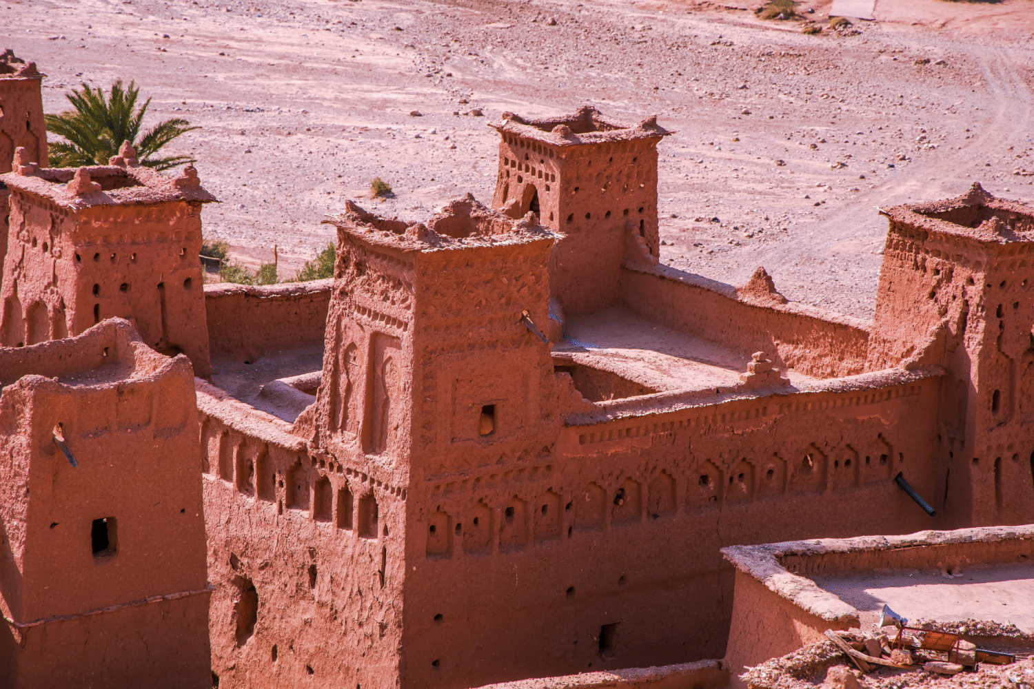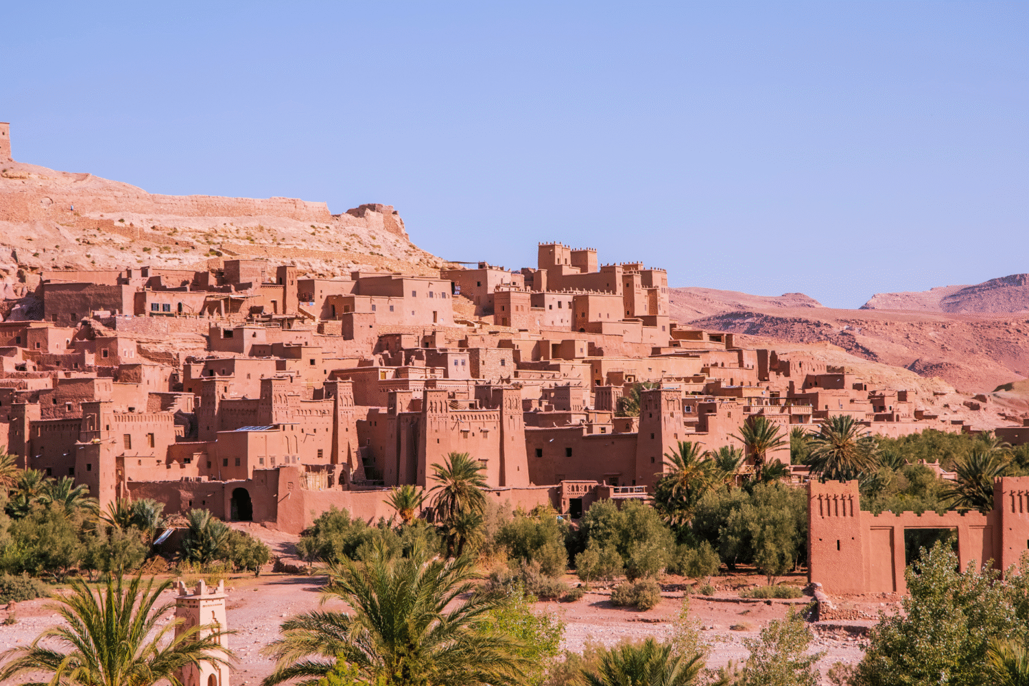 After breakfast, ride a camel back to your hotel for a refreshing shower. Depart for Rissani, famous for its bustling souks, and continue to Todra Gorge, renowned for its towering cliffs. Visit the Dades Gorges and the Valley of Roses before reaching Ouarzazate. Explore the Kasbah in the heart of the palm grove and discover why this area is known as “Morocco’s Hollywood.” Stay overnight at a riad in Ouarzazate.